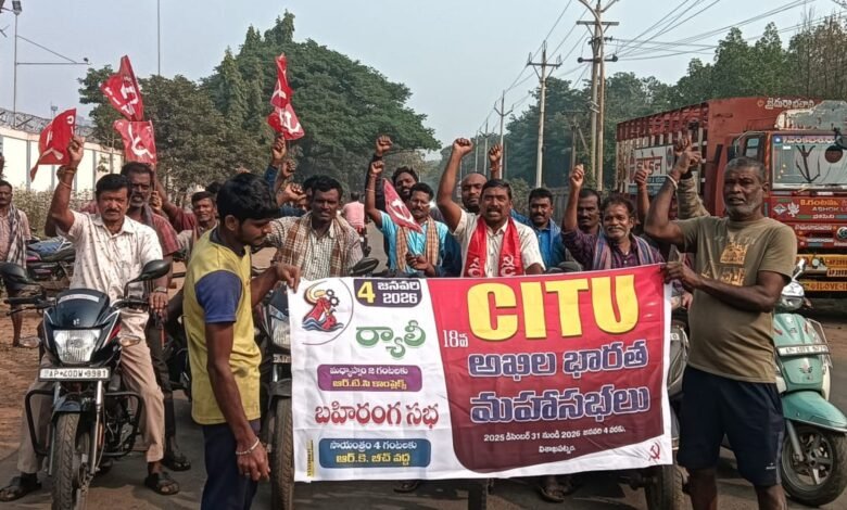సిఐటియు రాష్ట్ర కార్యవర్గ సభ్యులు గని శెట్టి పిలుపు పరవాడ. సిఐటియు అఖిల భారత మహాసభలు జయప్రదం చేయాలని జనవరి 4న విశాఖపట్నంలో జరిగే బహిరంగ సభను జయప్రదం చేయాలని సిఐటియు రాష్ట్ర కార్యవర్గ సభ్యులు గని శెట్టి సత్యనారాయణ పిలుపునిచ్చారు. పరవాడ మండలంలో ఫార్మసిటీలో శుక్రవారం బైక్ ర్యాలీ నిర్వహించారు. ఈ సందర్భంగాసిఐటియు రాష్ట్ర కార్యవర్గ సభ్యులు గని శెట్టి మాట్లాడుతూ సిఐటియు 18వ అఖిలభారత మహాసభలు జయప్రదం చేయండి. డిసెంబర్ 31 నుండి జనవరి 4 వరకు సిఐటియు అఖిలభారత మహాసభలు విశాఖపట్నం వేదిక కానున్నాయని సిఐటియు ఆవిర్భవించి 55 సంవత్సరాల కాలంలో మొదటిసారి ఆంధ్రప్రదేశ్లో విశాఖపట్నం మహాసభలకు వేదిక కానున్నదని. ఈ మహాసభలకు 2000 మంది ప్రతినిధులు అన్ని రాష్ట్రాల నుండి, కేంద్రపాలిత ప్రాంతాల నుండి హాజరవుతారని. ఈ మహాసభల్లో కేంద్ర బీజేపీ ప్రభుత్వం తీసుకొచ్చిన కార్మిక వ్యతిరేక లేబర్ కోడ్స్ ప్రైవేటీకరణ విధానాలకు వ్యతిరేకంగా చర్చించి భవిష్యత్తు పోరాటాలకు సిద్ధం అవుతారని. కేంద్ర బిజెపి ప్రభుత్వం తెచ్చిన నాలుగు లేబర్ కోడ్ కార్మిక వర్గానికి తీవ్ర నష్టం కలిగిస్తున్నాయని, బయటికి మేడిపండులా ఉన్న ఈ చట్టం లోపల కార్పొరేట్ కంపెనీలకి అనుకూలమైన విధానాల్ని అమలు చేస్తున్నారని. ఇప్పటివరకు ఉన్న హక్కుల్ని కాలరాస్తున్నారని. ఈనేపథ్యంలో జరుగు మహాసభల్లో ముగింపుగా జనవరి 4న భారీ బహిరంగ సభ నిర్వహించనున్నారని, ఈ మహాసభలు జయప్రదానికి కార్మికులు ప్రజలు పెద్ద ఎత్తున పాల్గొని జయప్రదం చేయాలని గని శెట్టి పిలుపునిచ్చారు. ఈ కార్యక్రమంలో కర్రీ పోతి నాయుడు, కే వెంకట్రావు, కే వెంక నాయుడు, ఏ రాజు, దూల. దేవుడు, వి కన్నబాబు, తదితరులు పాల్గొన్నారు